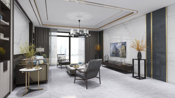 由黃銅與中性灰色調(diào)為主導(dǎo),搭配任意連紋的瑪雅灰,電視背景墻以白色的大理石瓷磚作為背景,一柔一剛形成一個(gè)巧妙的對比,舒適的感覺讓心靈可以得到一絲放松。