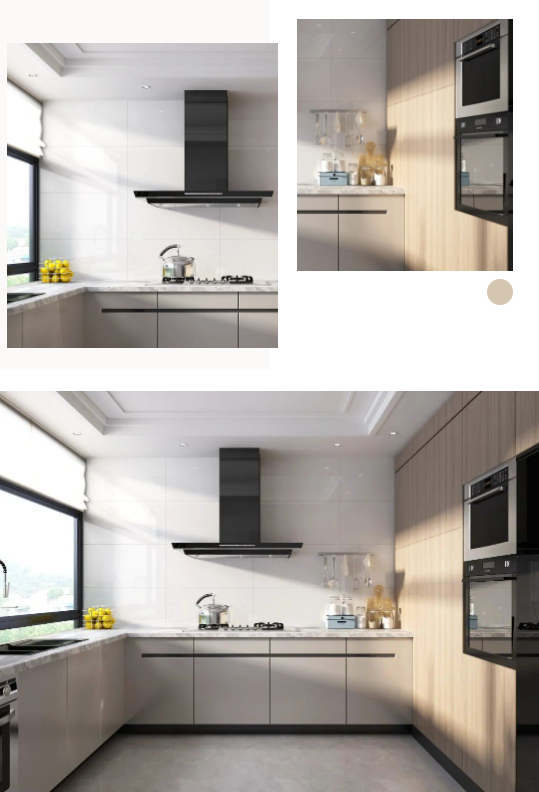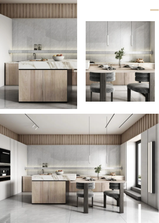 墻面通體瓷拋石中板馬特拉,清爽的色調(diào)既拓寬了廚房的空間感,一石多面又增添了些許靈動(dòng),在陽(yáng)光照射下,與暖調(diào)木紋互相輝映,建立起空間與自然之間的聯(lián)系,讓每次下廚都成為期待。