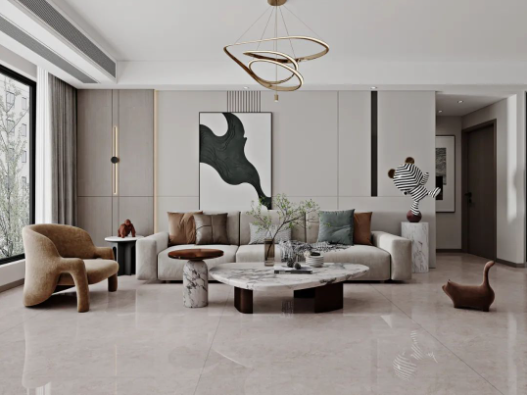 地面的主角哈爾施灰,飄逸的紋理,如無拘無束的靈魂,隨性優(yōu)雅。深淺不一的自然過渡,配合頗具檔次的不規(guī)則燈具、絨布沙發(fā)以及大膽有趣的抽象畫,讓空間充滿時(shí)尚,不落俗套。