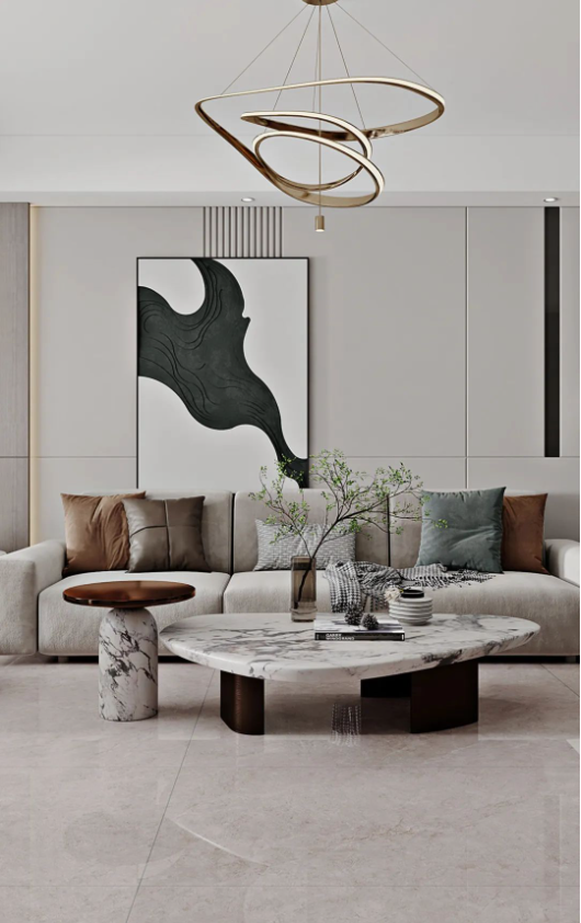 客廳采用挑高設(shè)計(jì),不僅能增強(qiáng)室內(nèi)采光效果,同時(shí)突出空間錯(cuò)落有致的層次感,讓客廳高級(jí)感瞬間拉滿,加上斯克深灰獨(dú)一無二的紋理,無論檔次、質(zhì)感、氣場(chǎng),都透露著別具一格的藝術(shù)氛圍。