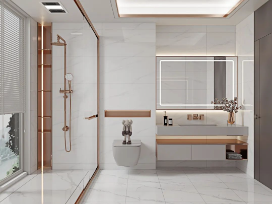 哥倫比亞白通體自帶的爽朗現(xiàn)代感,結合大理石紋進行通鋪,讓衛(wèi)浴間格外明亮之余,無限連紋拉伸空間視覺比例,給人一種賞心悅目的天然感受。