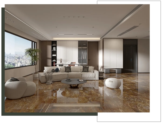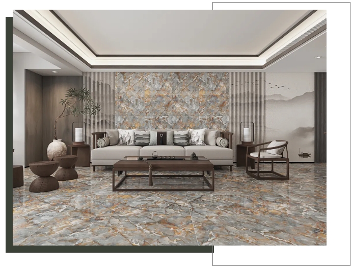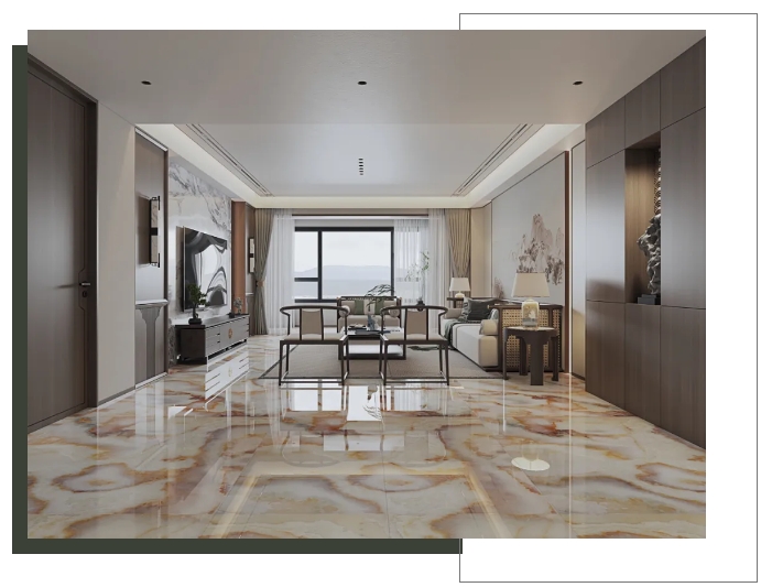 【瑪吉特】整體大面積上墻鋪地,打造出大氣磅礴的視覺張力,搭配新中式風(fēng)格的家居軟裝,將高級與優(yōu)雅平衡融入,盡顯居者不俗的審美品味。